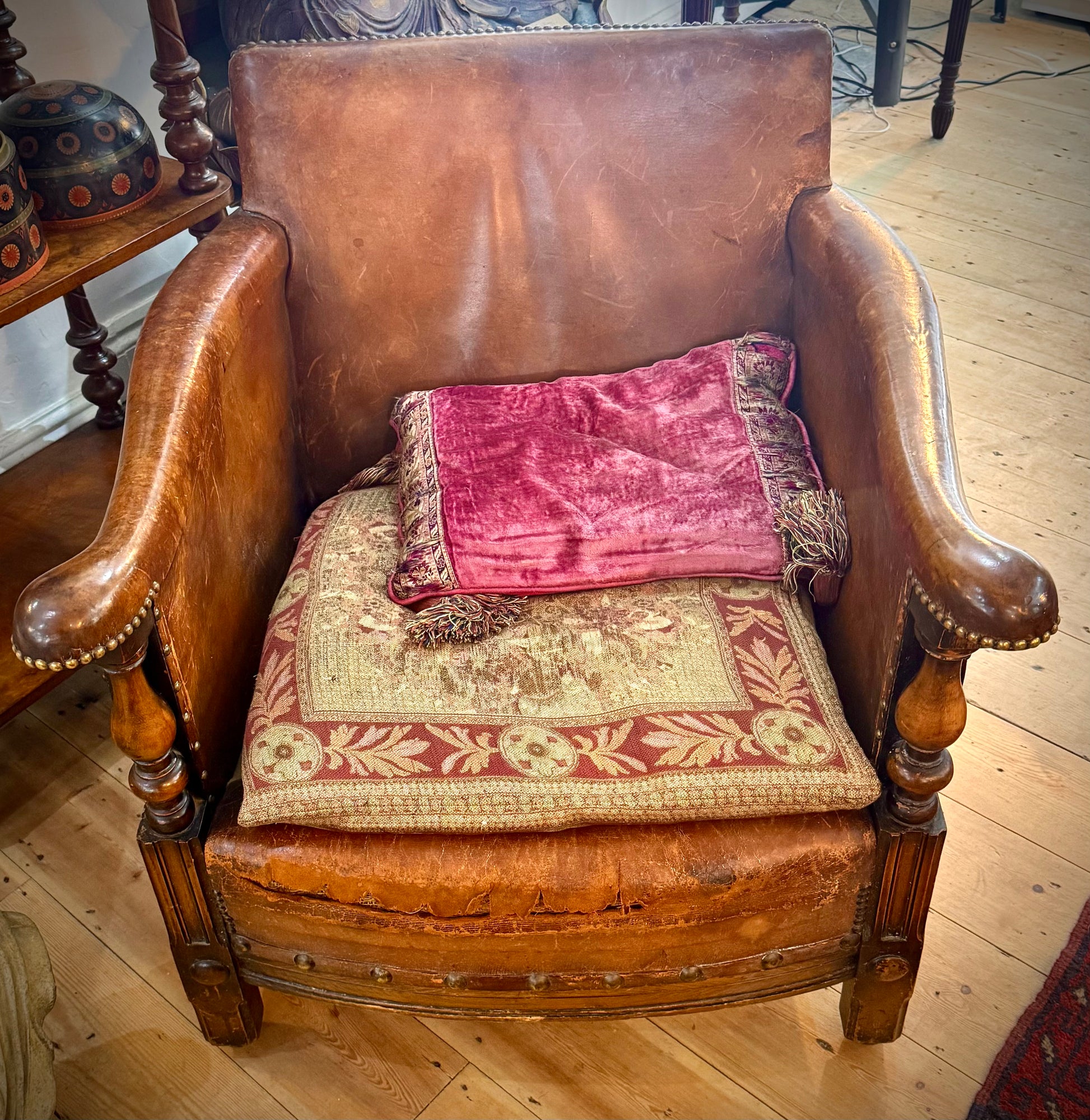 Arts and Crafts Leather ChairThe Arts and Crafts Leather Chair, dating from circa 1900, showcases a distinctive design with a rich patina, highlighting its character. Despite minor leather damage, its strong structure ensures longevity. With dimensions of approximately 120cm width, 200cm depth, and 120cm height, it offers a versatile addition to various spaces.
