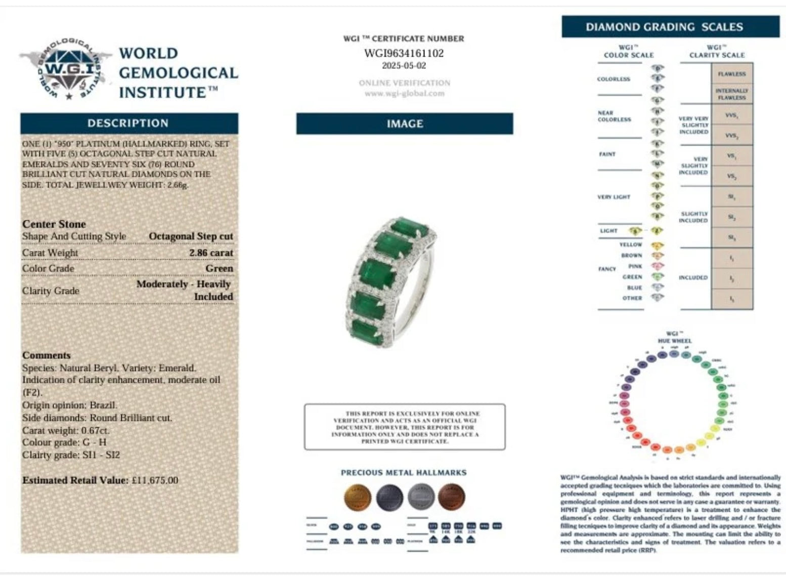 Platinum 5 stone cluster ring set with round emeralds and rbc diamonds. Emeralds 1.80ct. Diamonds 0.31ct |