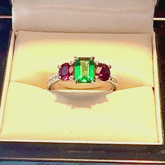 A stunning Emerald and Ruby Platinum Ring. A central Zambian Emerald with excellent colour with two rubies on either side and diamonds on the settings.