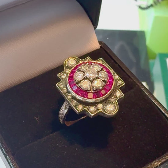 Certificated Victorian target style 8ct rose gold ring set with calibre cut rubies and rbc diamonds. Rubies approx. 0.58ct. Diamonds approx. 0.75ct. Cert. no.