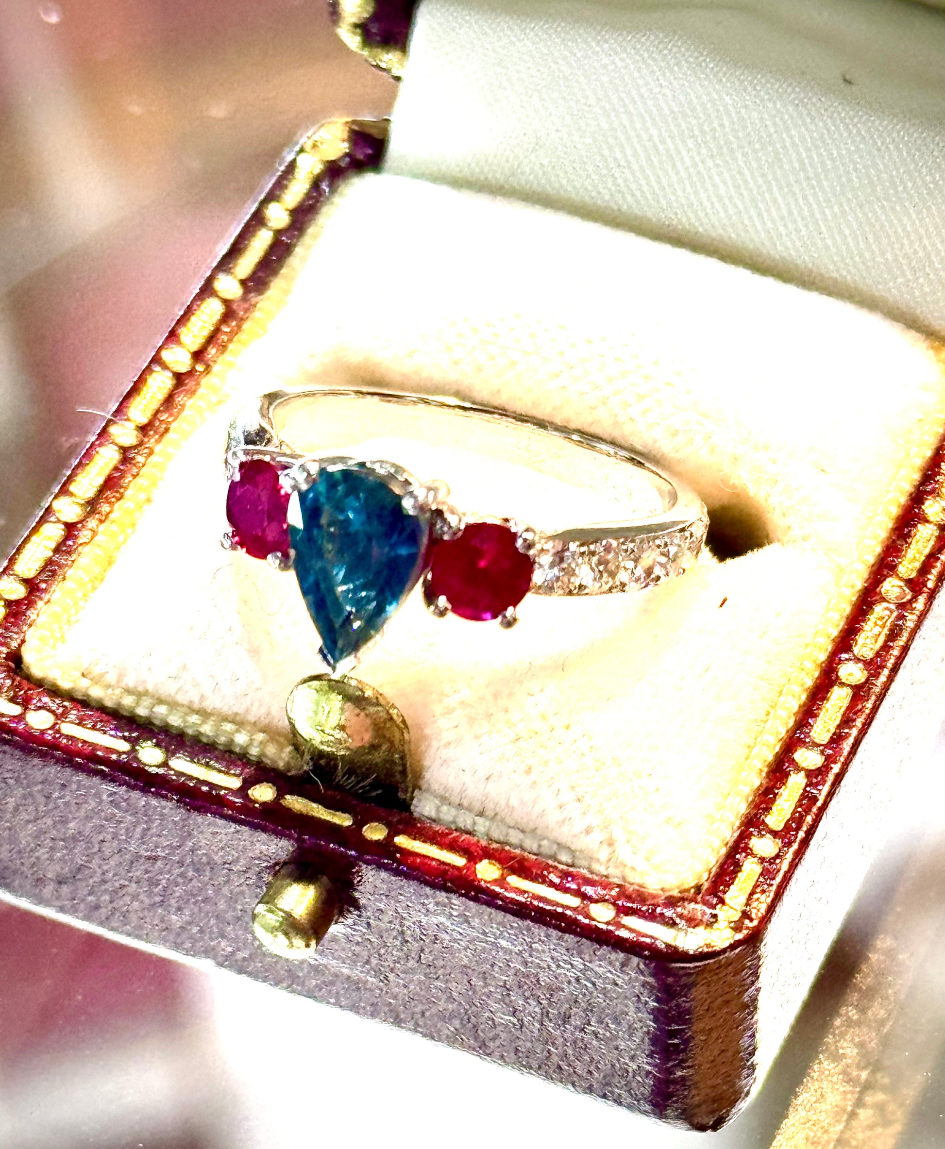 Sapphire (Not heat treated fully natural) 1.4ct with two vibrant Rubies 0.25ct and sparkling Diamonds VVS 0.85ct.