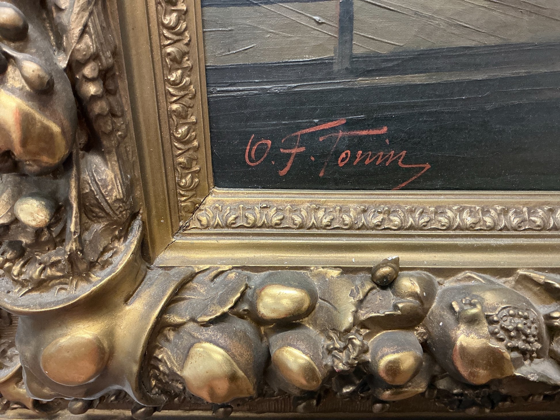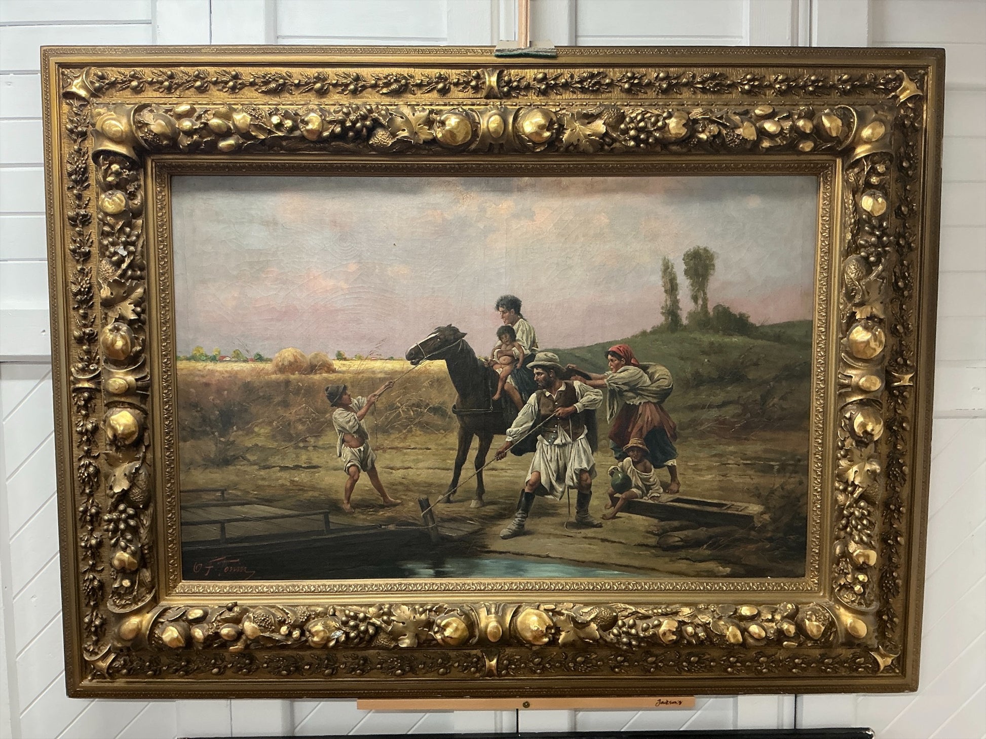 This 1860 painting, titled "The Cowboys," captures the strenuous lives of cowboys through skilled realism. The painting is framed in its original gilt gold frame.