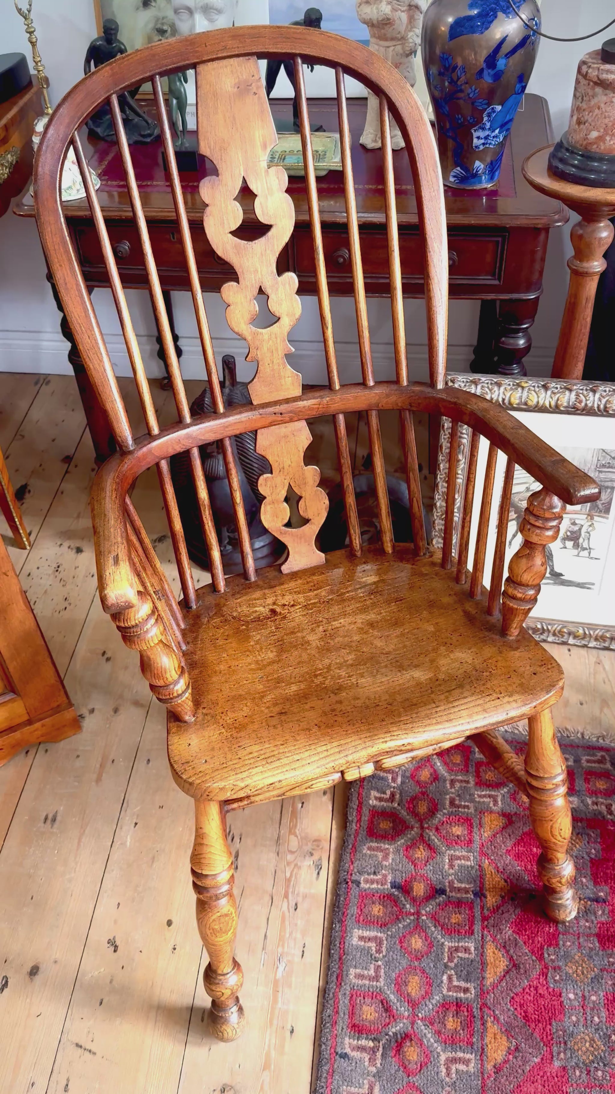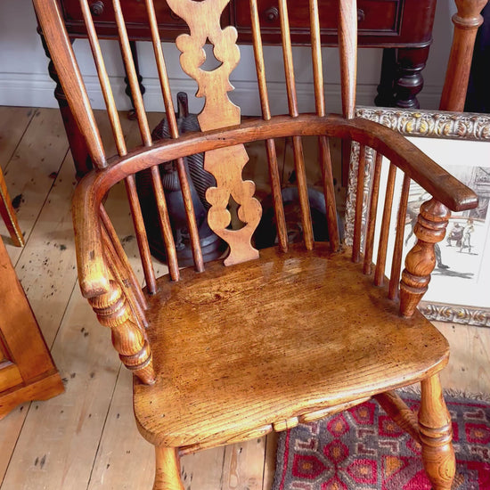 This image features a 19th-century antique elm and beech Windsor armchair. It is a classic high-back hoop design with a carved central splat.